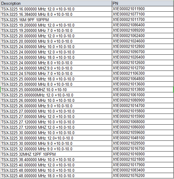 今天给大家介绍适用于便携式无线传输设备的3225无源那么就不得不提下TSX-3225ESPON的TSX-3225产品已经非常成熟,已经在各个产品各种应用环境中都有成熟的应用,业内人都知道,虽然爱普生已经开发出2520甚至更小尺寸2016无源晶振,但是尺寸更小,也代表着制造工艺越发繁琐成本的增高,现在很多便携式产品需要尺寸小,高性能,寿命长,价格适中的,3225已经相对而言属于小尺寸晶振,可以满足便携式设备的要求,价格也比2520,2016要低,厉害的是,TSX-3225无源晶振的成本比5032的也低,所以说TSX-3225是性价比较高的的选择。TSX-3225常用的型号中TSX-3225 24MHz 12PF±10PPMTSX-3225 16MHz 12PF 10PPM都是比较常用的两颗料工作温度:-40℃ ~ +85℃。TSX-3225系列无源晶振是一款应用比较广泛的爱普生无源晶振。因为其频率范围覆盖16MHz~48MHz。可以用于移动电话,蓝牙,无线-局域网,ISM 频段电台广播,MPU时钟等领域。下面南宫NG电子就把TSX-3225的常用的标准频率表分享给大家